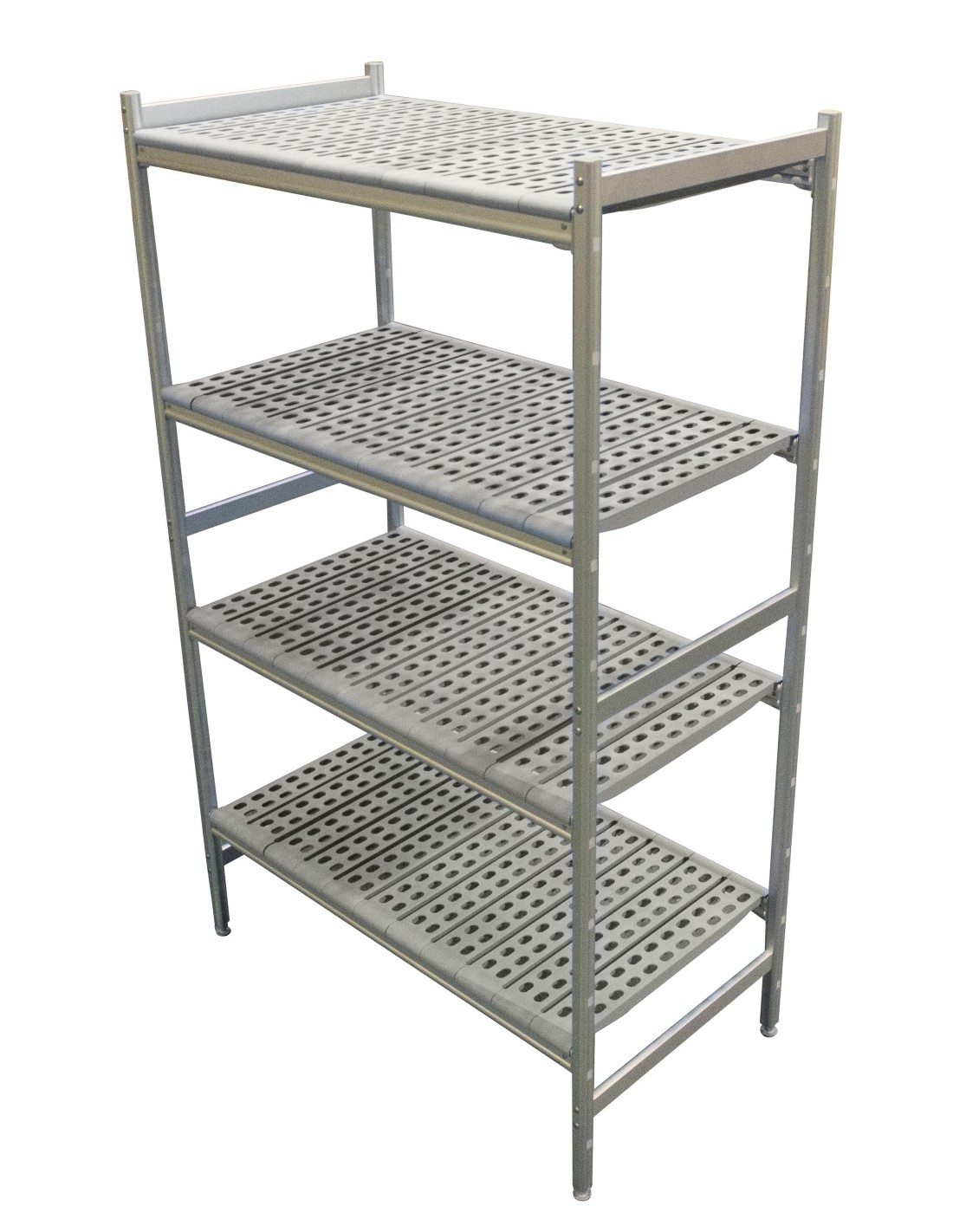 Structure tubulaire alliage d’aluminium anodisé avec montants 32x32 mm Etagère constituée de longerons et de plateaux polypropylène ajourés amovibles Vérins de réglage ±15 mm Montage sans outil - livré démonté Charge max. : 120 kg par niveau Hauteur des rayonnages : 1730 mm vérins rentrés (mini). 1745 mm vérins sortis Possibilité de montage jusqu’à 11 niveaux (réglage des niveaux tous les 150 mm)