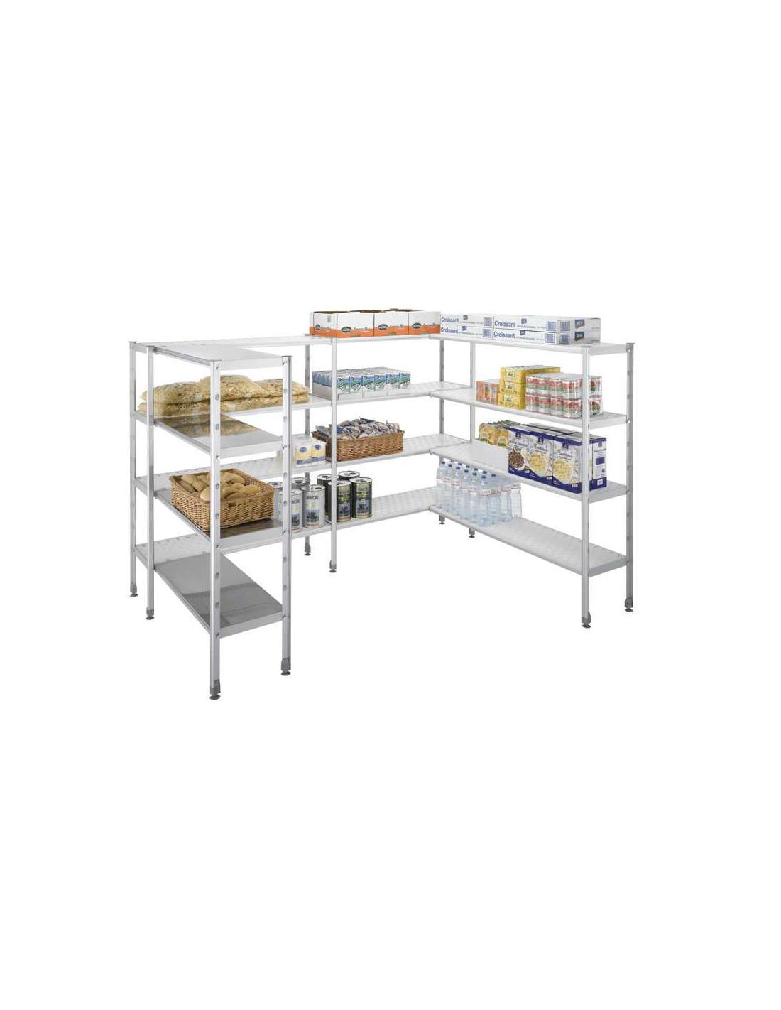 Structure en aluminium anodisé démontable sans outils. Clayettes ajourées en polypropylène. amovibles et lavables en machine Rayonnage livré démonté Stabilité des petits objets grâce à la largeur optimale Confort d'utilisation du polypropylène en froid positif et négatif Démontage et remontage facile des retours d'angle sans défaire le niveau porteur Hauteur : 2055 mm dont le vérin réglable hauteur réglable sur 10 positions L- hors tout : 1392mm. profondeur 630. 5 niveaux