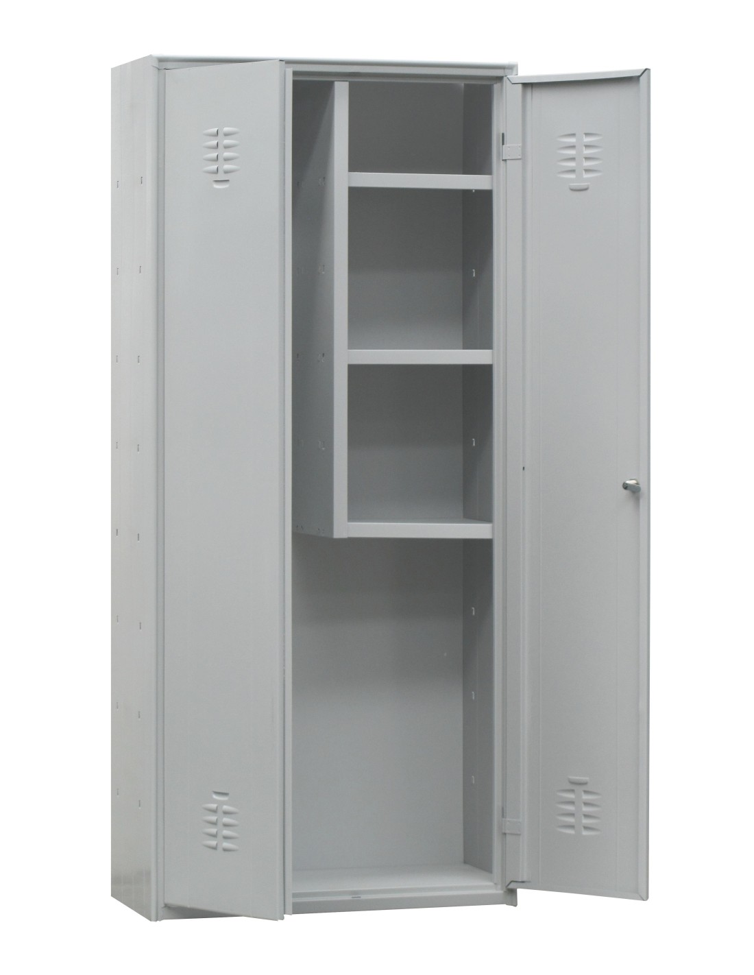 Construction acier monobloc soudée. peinture cuite au four à 180°C Pieds soudés. porte étiquette sur chaque porte Portes battantes Charnières internes spéciales anti-effraction Ouïes d’aération hautes sur chacune des portes Omega de renfort des portes à l’intérieur Armoires à balais sans pieds avec 3 étagères intermédiaires fixes à droite Fermeture par serrure à clé (avec jeu de 2 clés) Corps : couleur gris RAL 7035